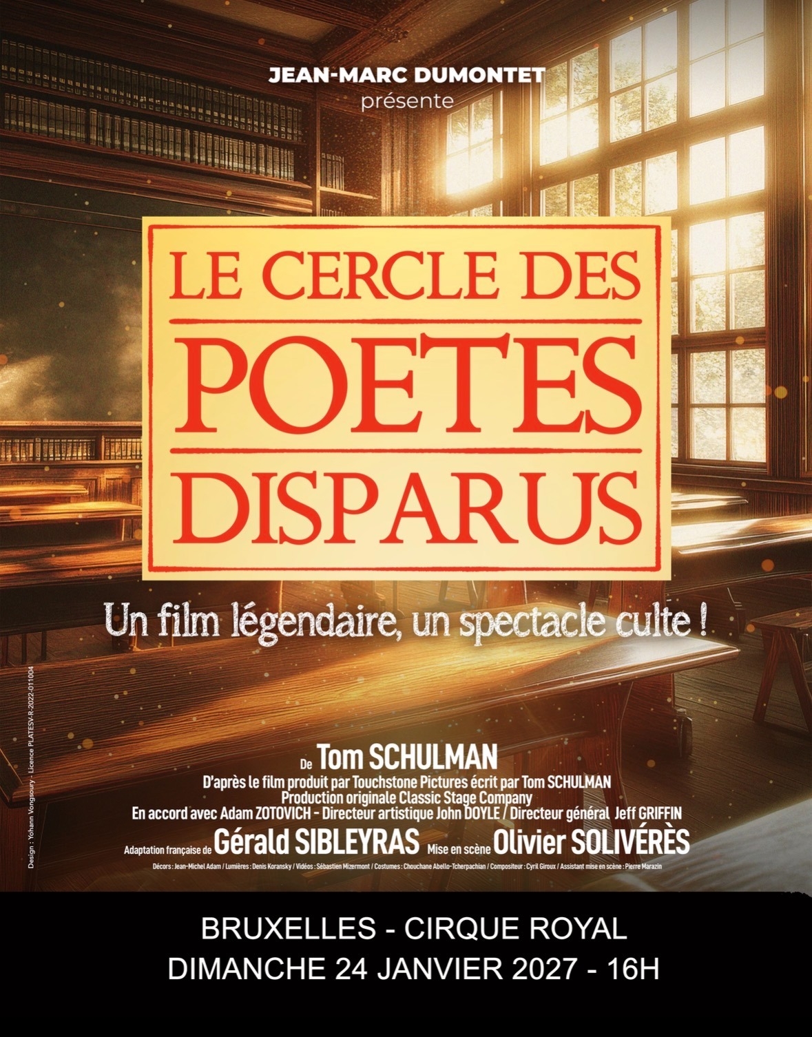 De Tom Schulman d’après le film produit par Touchstone Picture Après plus de deux ans de triomphe sur les planches à Paris et en tournée dans toute la France, le phénomène théâtral Le Cercle des Poètes disparus fait escale à Bruxelles Oh Capitaine, mon Capitaine… Cette réplique du Cercle des Poètes Disparus résonne toujours. Ce professeur charismatique et iconoclaste inspire ses jeunes élèves s’ouvrant à la vie, loin du carcan des conventions qu’incarne leur établissement. Histoire émouvante et contemporaine, la pièce célèbre l’amitié, l’émancipation, la transmission au moment où se dessinent personnalités et destins.
